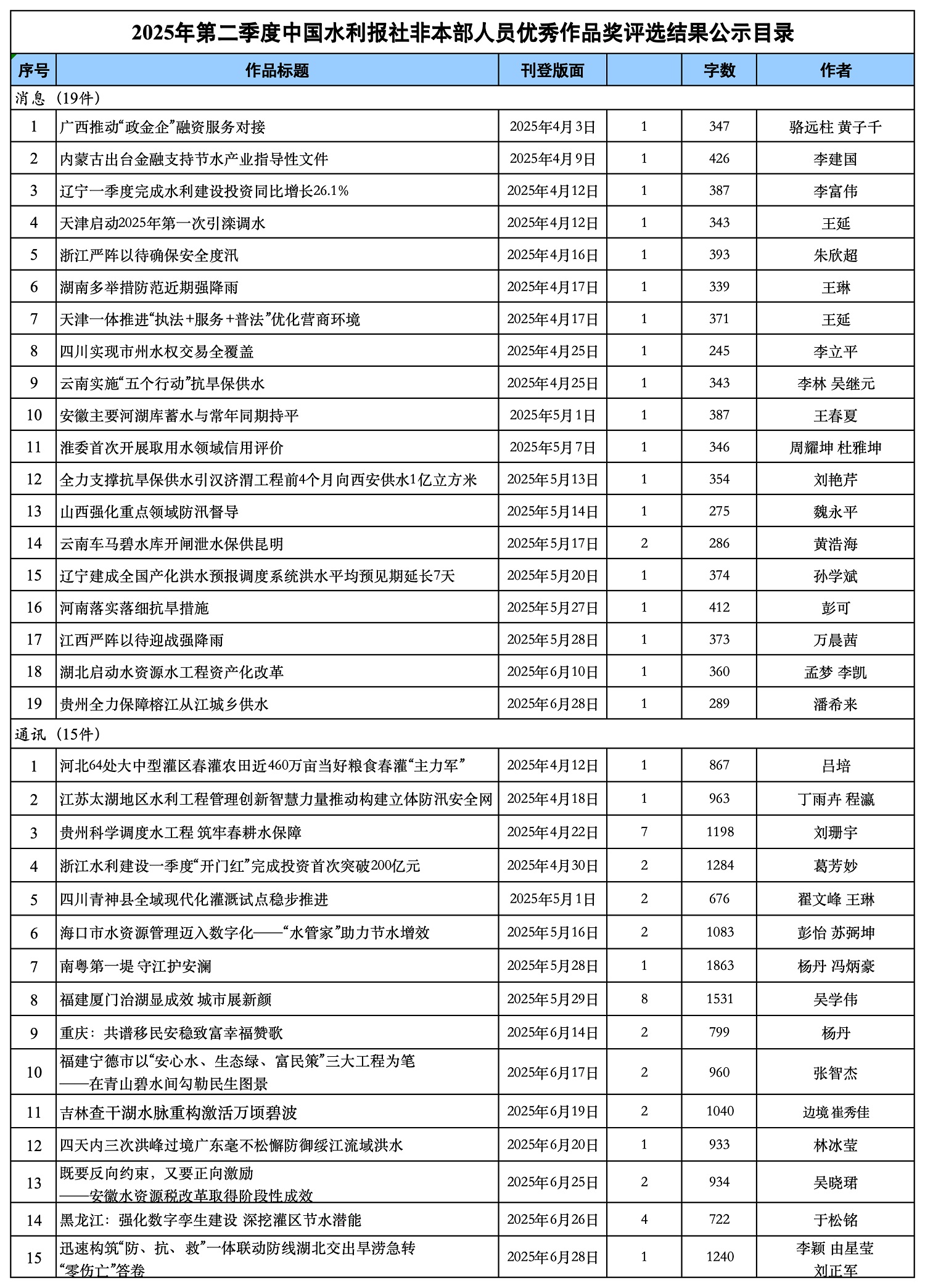2025年第二季度中國水利報社非本部人員優(yōu)秀作品獎評選結(jié)果公示