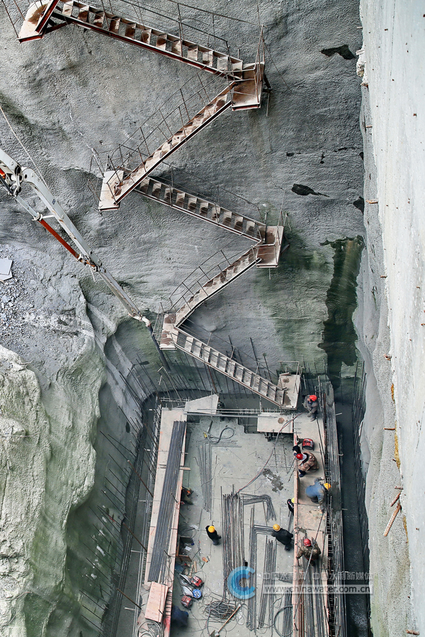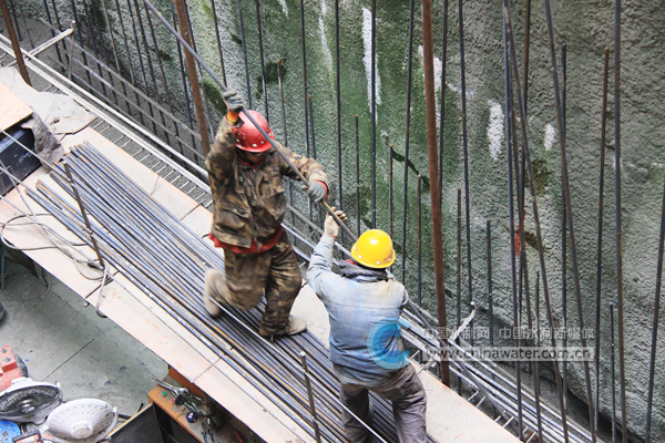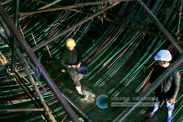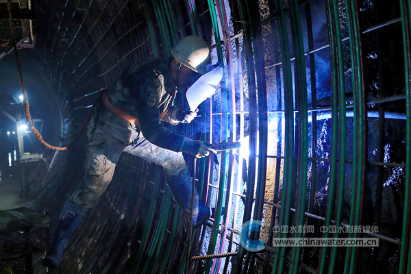 在中部引水工程豐滿水庫(kù)取水口施工現(xiàn)場(chǎng),記者沿著簡(jiǎn)易鐵梯逐級(jí)下到深達(dá)50米的閘門井和攔污柵作業(yè)面,只見工人們冒著細(xì)雨,正在進(jìn)行鋼筋綁扎、混凝土投料平倉(cāng)、振搗等施工。