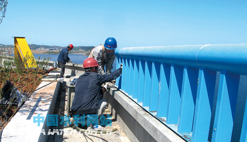 正在壩頂進(jìn)行的防護(hù)欄桿更換也是壩區(qū)美化的其中一項(xiàng)。結(jié)合了安全防護(hù)和美觀的要求,中線水源公司對(duì)原有的上下游施工欄桿進(jìn)行了更換,取而代之的是與碧水藍(lán)天相呼應(yīng)的“水利藍(lán)”桿體,總長(zhǎng)2000多米,安全性能優(yōu)越。