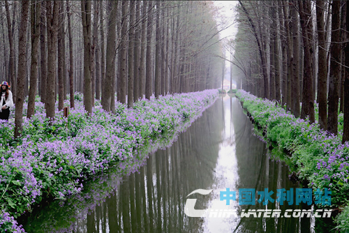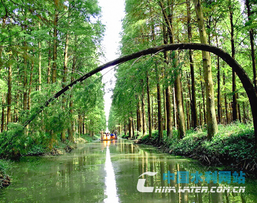 水上森林,原是低洼地,為防水澇,挖取泥土堆成一個(gè)個(gè)長方形土垛,上面種植水杉樹,淺淺的水渠連著外面的湖水,形成島嶼似的森林。水淺了它露在淺灘上,湖深了它浸潤水中,水杉喝足了水,猛長,于寧靜碧波中搖曳著綠色的倒影。
