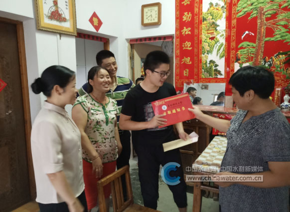 長(zhǎng)豐縣水務(wù)局工作人員來到左店鄉(xiāng)梁曹村,把全體機(jī)關(guān)工作人員捐助的6050元分別送到兩名大學(xué)新生手中