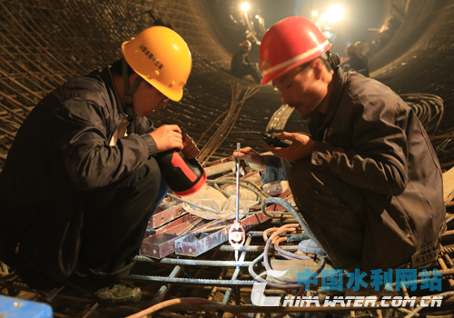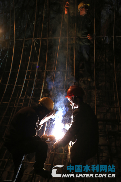 中國水利網(wǎng)站10月31日訊 (記者 聶生勇/李先明/)測量、搬運、綁扎、焊接,建設者不顧洞內泥濘、潮濕的環(huán)境,專心操作;飛濺的電火花、忙碌的身影,映襯在密密麻麻的鋼筋籠上,構成一個個跳動的音符,組成一曲深洞中的交響曲――這是記者10月25日在貴州黔中水利樞紐大壩工程的泄洪放空洞內看到的場景。