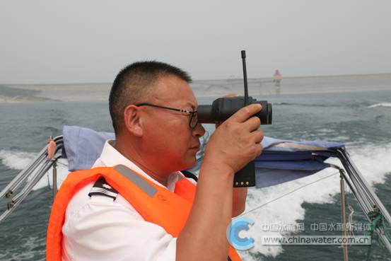 王快庫區(qū)周邊,有5個鄉(xiāng)鎮(zhèn),20多個村,約3萬人。巡查隊員說,他們一方面制止違法違規(guī)行為,一方面還肩負著普法宣傳任務,為的就是保護好這一池清水,保護好水利工程,保護好人民群眾生命財產(chǎn)安全。圖為52歲的水政監(jiān)察大隊隊長蔡保義在船上用望遠鏡瞭望觀察。