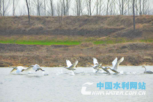 中國水利網(wǎng)站訊 隨著天氣轉(zhuǎn)暖,近日,今年的首批大天鵝重回中華龍鄉(xiāng)——濮陽黃河,它們時而悠閑覓食,時而傾情戲水,時而展翅翱翔,時而引吭高歌……,成為了新春黃河的一道靚麗風景,吸引著眾多群眾前來觀賞。