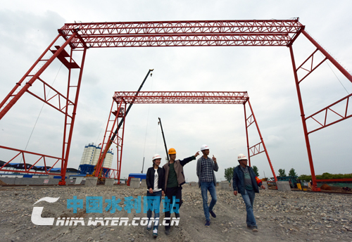 這里上接3標(biāo)倒虹吸工程。當(dāng)渠道與道路或河溝高程接近,處于平面交叉時(shí),需要修建倒虹吸,使水從路面或河溝下穿過(guò)。這節(jié)240米倒虹吸從公路下穿過(guò),然后與渡槽對(duì)接。龐文戰(zhàn)手指建好的“凸型”水泥墩說(shuō),先由龍門吊把渡槽從生產(chǎn)車間吊到這里成排存放,然后由架槽車再將其吊起,置于六七米高的橋墩上組裝。渡槽長(zhǎng)30米、寬8.7米、高7.1米,每節(jié)重達(dá)1200噸,每節(jié)鋼筋就有70噸重。36米的軌道間距、400米長(zhǎng)的雙軌道場(chǎng)地上,架槽車將以每小時(shí)60米的速度緩行,逐節(jié)架設(shè)5公里長(zhǎng)的渡槽。因?yàn)楣こ毯拼,每個(gè)環(huán)節(jié)都一論再論,每張圖紙都一審再審,專家們多次現(xiàn)場(chǎng)優(yōu)化方案!跋乱徊礁呖兆鳂I(yè)難度更大,我們?nèi)缏谋”?.....”技術(shù)員、安全員不敢有絲毫麻痹大意,每天現(xiàn)場(chǎng)檢查。眼下仿佛大戰(zhàn)前的寧?kù)o,一墩墩存放渡槽的水泥臺(tái)柱,像等侯上陣的士兵,不難想像,架槽車啟動(dòng)之時(shí),將是怎樣壯觀景象!