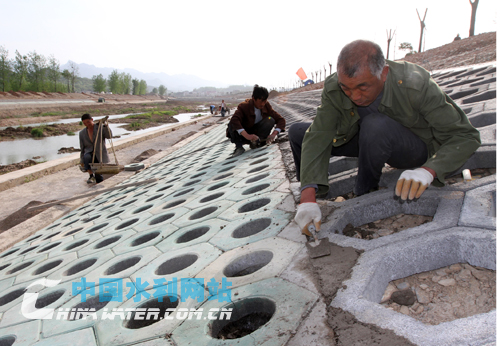 生態(tài)砌塊護堤并將砌塊中心種植草本植物