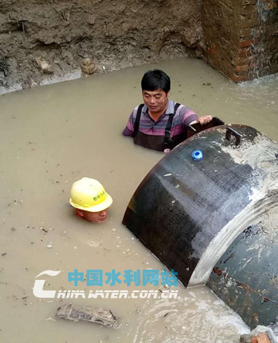 “這情行,只能帶水施工了。”有著多年管網(wǎng)搶修經(jīng)驗(yàn)的老職工張肯堂提出了自己看法。別無(wú)他法的眾人只得聽(tīng)從這一建議,大家紛紛跳入半人多深的污水塘中,配合吊車在管漏處安裝上套桶。然而,在充填堵漏王時(shí),因管粗水深人的膀子無(wú)法夠到管底,搶修難以繼續(xù)。