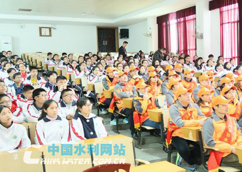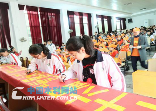 宣傳活動上,同學(xué)們觀看了愛護(hù)水資源,防治水污染的宣傳故事片。學(xué)生代表發(fā)表了他們的觀后感?催^宣傳片后,他們了解到中國是一個(gè)缺水的國家,水體分布嚴(yán)重不均衡。并且水污染也是我們國家一個(gè)嚴(yán)重的社會問題。他們表示將節(jié)約用水,做到一水多用,人走龍頭關(guān);不往河湖中扔垃圾,愛護(hù)水資源;積極宣傳節(jié)約用水,讓大家都參與愛水護(hù)水的活動中來。接著,水利局工作人員為同學(xué)們發(fā)放了節(jié)水愛水宣傳手冊。最后,同學(xué)們在宣傳橫幅上莊嚴(yán)簽名。
