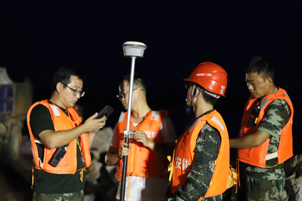 29歲的廖柏輝和26歲的羅嗣陽是搶險現場的測量員,每日將精密的儀器扛上肩頭,行走在滿是泥土的河堤上,實時監(jiān)測水位及測量推進距離等重要數據,并報告指揮中心,用數據為搶險開進提供有力支撐。
