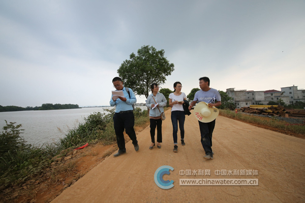 作者(右二)與本報(bào)記者在碗子圩上采訪彭世琥  劉國南/攝