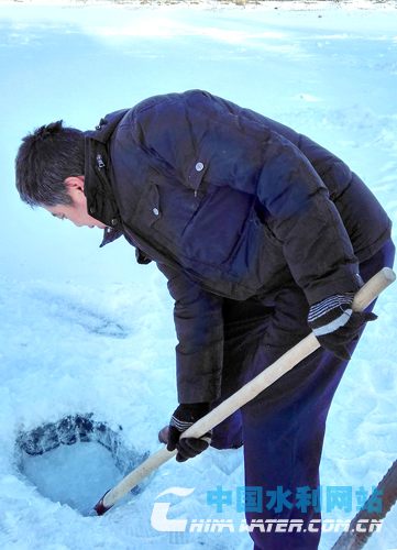 天寒地凍,哈氣成冰。在鑿冰孔過(guò)程中,三位職工的褲子濺滿了河水,瞬間凍結(jié)成了冰花鎧甲,眉毛胡子上也掛滿了冰霜。由于冰層較厚,按照規(guī)定,需開(kāi)鑿8個(gè)冰孔才能滿足測(cè)流要求,每個(gè)冰孔深度為60—70厘米,勞動(dòng)強(qiáng)度很大。在不方便站立的地方,還得趴在雪地上作業(yè)。因?yàn)楸鶎虞^厚,所以每一個(gè)冰孔鑿起來(lái)都十分辛苦。于是,三個(gè)人輪換著交替進(jìn)行。不一會(huì)兒,他們戴在頭上的帽子就被甩掉了,臉上流淌著汗水,頭上冒著熱氣。這個(gè)平均年齡已經(jīng)超過(guò)50歲的小集體,干得熱火朝天。