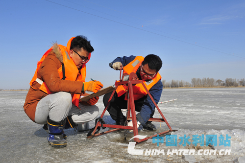 頭道拐水文站職工在冰上進(jìn)行凌汛開(kāi)河水文測(cè)驗(yàn) 龍虎
