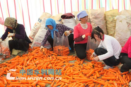 農(nóng)戶正在將經(jīng)過清洗的胡蘿卜裝袋