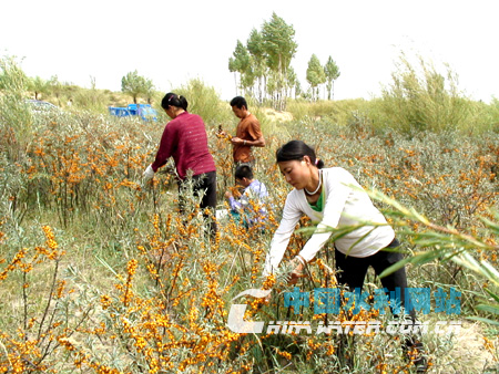 2003年,水利部沙棘中心經(jīng)過對立地條件、水肥條件、氣候條件等因素的認(rèn)真比選,將榆陽區(qū)岔河則鄉(xiāng)什它汗村確定為俄羅斯沙棘與中國沙棘雜交新品種試驗(yàn)示范種植區(qū),引種大果沙棘240畝。經(jīng)過榆林市沙棘中心和榆陽區(qū)水利局專業(yè)技術(shù)人員的共同努力,在項(xiàng)目區(qū)群眾的精心管護(hù)下,大果沙棘長勢旺盛。于2005年開始掛果,今年進(jìn)入盛果期。經(jīng)測試,平均畝產(chǎn)達(dá)600公斤。按每公斤1.8元計(jì)算,每畝產(chǎn)值達(dá)到1080元!安粷菜、不上糞,不費(fèi)工,瞎沙灣快頂上水澆地啦!”聽到測算結(jié)果的村民劉志國驚訝地說。