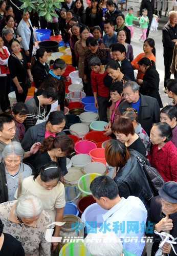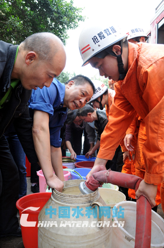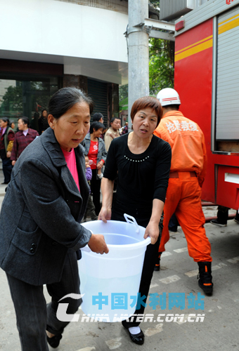 中國水利網(wǎng)站10月9日訊 2011年10月8日,四川省廣安市岳池縣石埡場鎮(zhèn)的缺水居民,秩序井然地排隊領(lǐng)取消防官兵送來的生活用水。