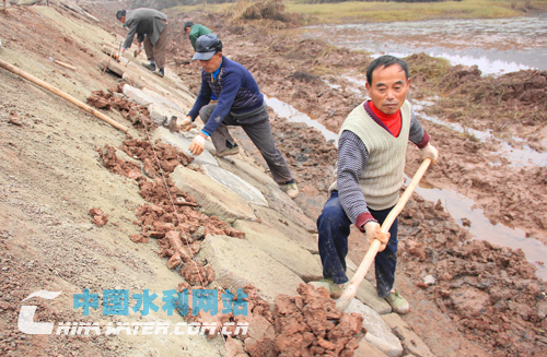 村民們正忙著修建山坪塘迎水面護(hù)坡
