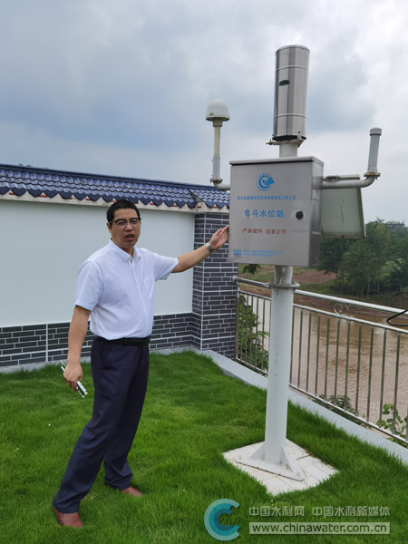 眉山水文水資源勘測中心副主任朱國介紹北斗水文站水雨情監(jiān)測儀  (記者 羅景月 攝)