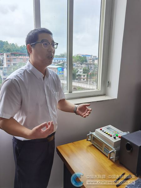 眉山水文水資源勘測中心副主任朱國介紹北斗水文站傳統(tǒng)水文測控儀  (記者 羅景月 攝)
