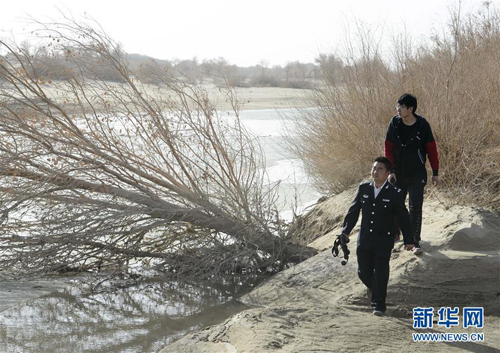 2月27日,大西海子水庫管理站工作人員陳世平(前)與香承志進(jìn)行河道巡查