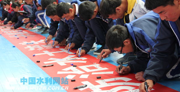 學(xué)生們在防治水土流失橫幅上簽名