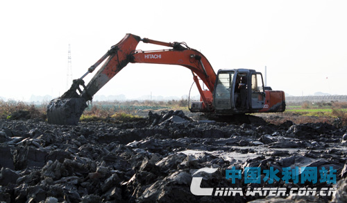 挖掘機(jī)和施工人員正在臺州市路橋區(qū)金清大港附近挖河床泥漿
