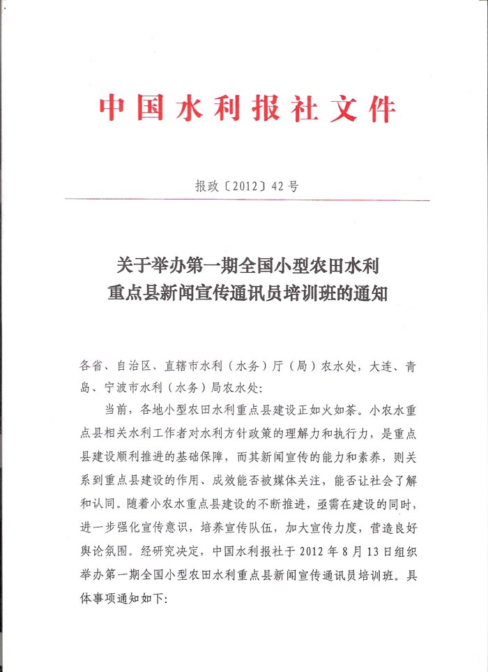 關(guān)于舉辦第一期全國(guó)小型農(nóng)田水利重點(diǎn)縣新聞宣傳通訊員培訓(xùn)班的通知