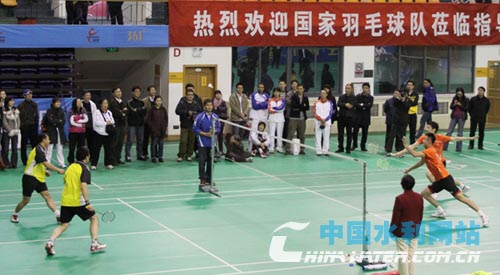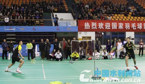 國家羽毛球隊隊員徐晨、張楠與水利職工進行男雙表演賽