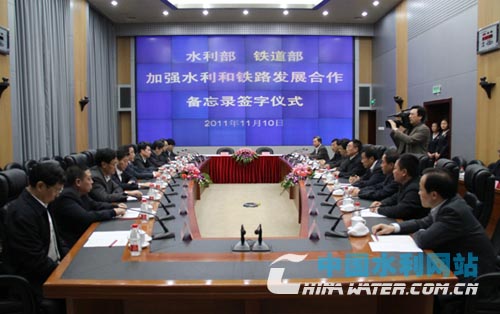 中國(guó)水利網(wǎng)站訊 (記者 王浩宇 通訊員 朱朝明)2011年11月10日,水利部與鐵道部在京簽訂加強(qiáng)水利和鐵路發(fā)展合作備忘錄。此舉是兩部深入貫徹科學(xué)發(fā)展觀、全面落實(shí)今年中央1號(hào)文件和中央水利工作會(huì)議精神,認(rèn)真實(shí)施《國(guó)民經(jīng)濟(jì)和社會(huì)發(fā)展第十二個(gè)五年規(guī)劃綱要》以及水利、鐵路發(fā)展“十二五”規(guī)劃的重要舉措,對(duì)于促進(jìn)水利和鐵路事業(yè)全面協(xié)調(diào)可持續(xù)發(fā)展,更好地發(fā)揮水利、鐵路對(duì)國(guó)民經(jīng)濟(jì)和社會(huì)發(fā)展的支撐保障作用,具有重大而深遠(yuǎn)的意義。水利部部長(zhǎng)陳雷、鐵道部部長(zhǎng)盛光祖出席簽字儀式并講話。