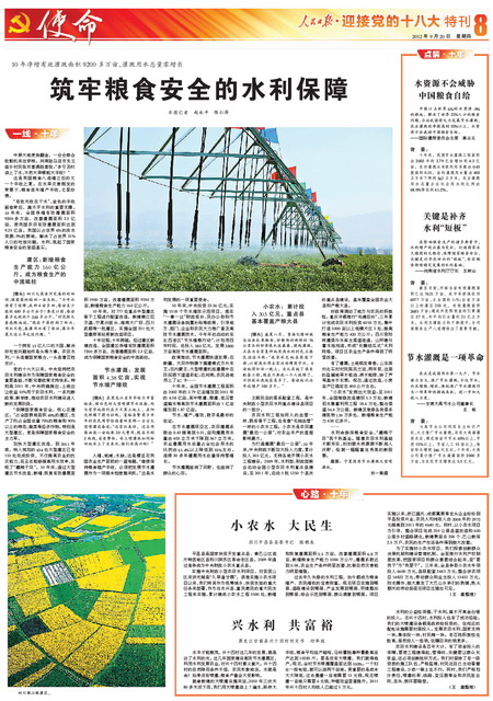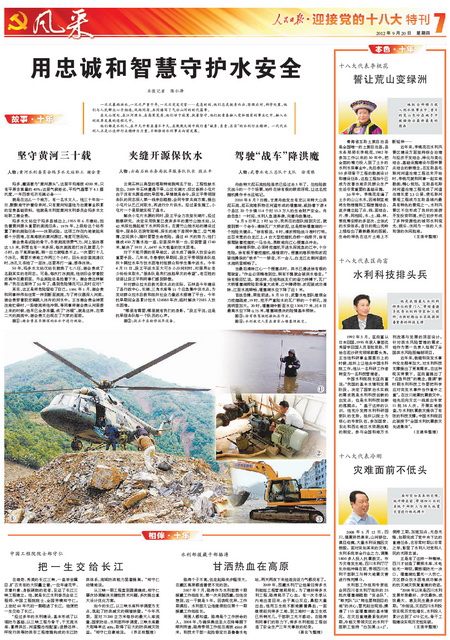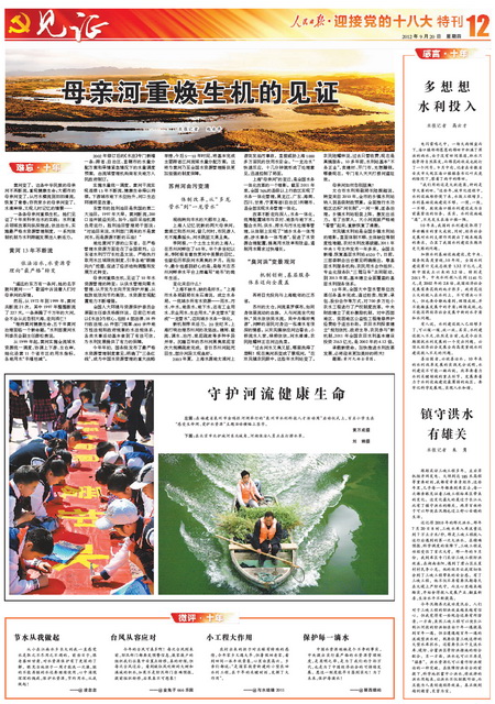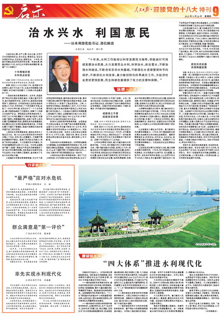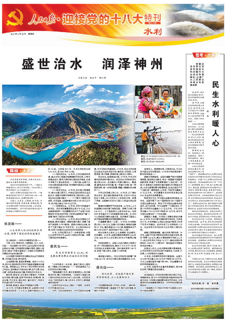 盛世治水譜華章,興水惠民鑄輝煌。為迎接黨的十八大召開,全面展示黨的十六大以來水利改革發(fā)展的輝煌成就,人民日報提前策劃、精心組織“迎接黨的十八大”水利特刊。部領(lǐng)導(dǎo)高度重視,周密部署,精心指導(dǎo),辦公廳牽頭負責(zé),新聞宣傳中心、水利報社會同部機關(guān)各司局密切配合,提供了大量內(nèi)容詳實、豐富鮮活的典型素材,部有關(guān)直屬單位、有關(guān)省市水利廳局全力支持配合。9月20日,凝聚了人民日報編輯記者心血和汗水的“迎接黨的十八大”水利特刊濃墨重彩推出,特刊從“巨變”、“歷程”、“風(fēng)采”、“啟示”、“使命”等多個角度,共8個整版(可點擊圖片顯示)21篇文字稿、34幅圖片圖表,多角度、全方位展示了十年來水利事業(yè)取得的輝煌跨越,喜慶熱烈,圖文并茂,氣勢恢宏,給人以強烈的震撼。現(xiàn)將特刊展示如下: