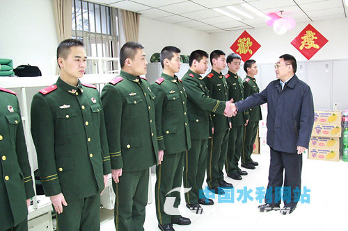 中國水利網(wǎng)站訊 (記者 陳銳 周妍) 在蛇年新春佳節(jié)即將到來之際,1月31日下午,水利部部長陳雷一行親切看望慰問駐部武警戰(zhàn)士和機(jī)關(guān)后勤干部職工,送去部黨組的親切關(guān)懷和新春祝福。部領(lǐng)導(dǎo)矯勇、董力、胡四一、劉寧、李國英、蔡其華,總工程師汪洪、總規(guī)劃師周學(xué)文一同看望慰問。