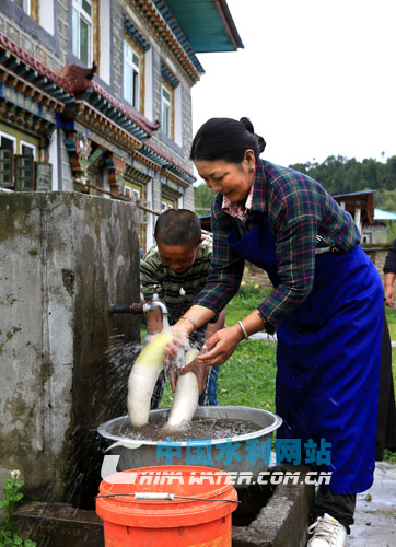 米林縣八口之家女主人白瑪在用清潔自來水洗菜 (本站記者 繆宜江 攝)