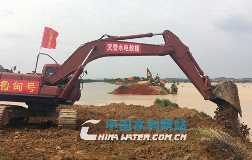 6月22日13時,江西鄱陽縣濱田河向陽圩。紅旗獵獵,機械轟鳴,武警水電部隊一輛輛滿載土石的翻斗卡車奔向向陽圩決口處,幾臺挖掘機開始揮舞巨大手臂奮力作業(yè)……向陽圩決口封堵戰(zhàn)正式打響。