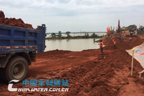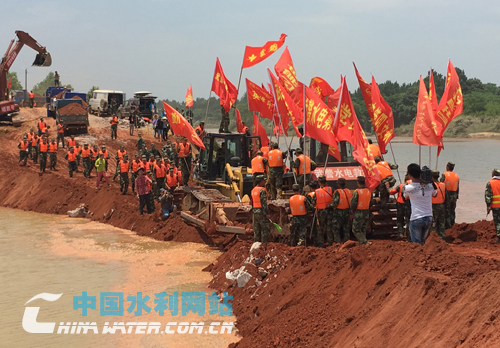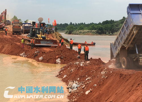 6月20日19時(shí)20分,鄱陽(yáng)縣向陽(yáng)圩因高水位急劇上升、昌江洪峰通過(guò)疊加作用出現(xiàn)潰口。6月22日13時(shí),經(jīng)過(guò)1天多的搶險(xiǎn)救災(zāi)與封堵準(zhǔn)備工作,向陽(yáng)圩封堵“戰(zhàn)斗”打響。“水電鐵軍”——武警水電第二總隊(duì)500多名官兵夜以繼日“作戰(zhàn)”,附近村民積極支援,軍民一心,人歇機(jī)不歇。經(jīng)過(guò)47小時(shí)的奮戰(zhàn),向陽(yáng)圩得以順利合龍。