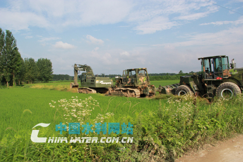 部隊(duì)的搶險(xiǎn)施工機(jī)械嚴(yán)陣以待