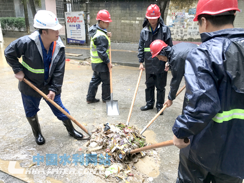 中國水電十五局職工暴雨過后正在街道清淤 本報記者 吳頔/攝