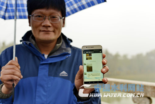 11月17日,江蘇宿遷市宿豫區(qū)委組織部副部長(zhǎng)王新軍在六塘河邊向記者展示河長(zhǎng)溫世才通過(guò)微信群指揮治河工作的畫面。 本報(bào)記者 李先明/攝