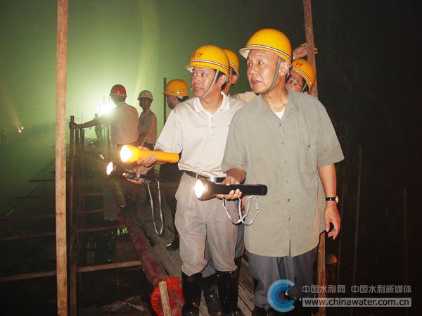 劉志明(左一)陪同鄭守仁院士查看構皮灘水電站建設情況 長江設計院供圖