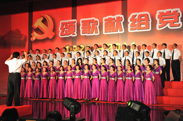 隨后,一臺精彩的演出逐次登場。舞蹈、童聲合唱、歌劇……百花齊放,演員們都以昂揚的精神風貌向黨的90歲生日獻禮,他們精彩的表演引來與會代表一陣陣熱烈的掌聲。全場大合唱《沒有共產黨就沒有新中國》的雄壯歌聲,將現場氣氛推至高潮,大會圓滿落幕。
