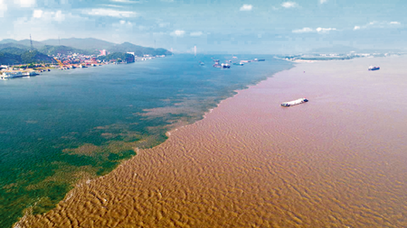 在江西省九江市湖口縣,長江與鄱陽湖兩水相匯處近日出現(xiàn)了一條蔚為壯觀的黃綠色交匯帶。鄱陽湖水清澈透綠,長江水略略發(fā)黃。過去由于采砂等原因,砂石從湖底吸上來,細砂被抽走,粗砂則直接傾倒在湖中,鄱陽湖水比長江渾濁。近年來,對河道采砂、非法捕撈和污水排放進行了嚴厲打擊和控制,如今鄱陽湖水明顯清澈于長江,兩水相匯處,呈現(xiàn)出“涇渭分明”的新景觀。