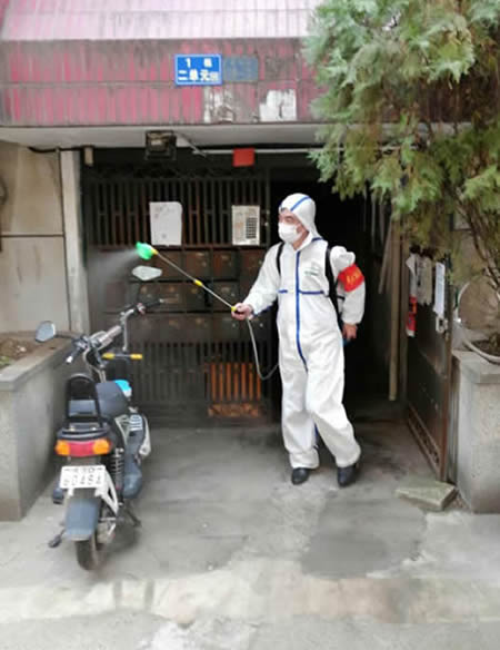 院子里有疑似病例的門棟需要做消殺,周傳才二話不說就扛起50多斤的設(shè)備,和負(fù)責(zé)消殺的陳師傅、林師傅輪流把整個(gè)單元和綠化帶重點(diǎn)消毒一遍。