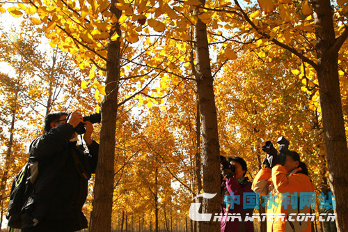 媒體記者采訪濟(jì)南黃河千畝銀杏盛景
