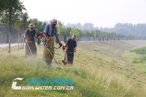 “我們修剪堤草主要是給草皮理理發(fā),改善一下堤防面貌,也能防止雜草秋天結(jié)籽! 管理員老顏告訴筆者,“從堤肩到堤腳,包括柳蔭地,所有的草皮都要修剪,工程量大,質(zhì)量要求高,每天工作時(shí)間長(zhǎng),現(xiàn)在已經(jīng)完成了1000多米堤防的草皮修剪任務(wù)!彼f(shuō),現(xiàn)在堤防上不光是修剪草皮,有的在整理防汛備防石,有的在整理堤頂?shù)姆雷o(hù)墩,有的清理險(xiǎn)工根石上的雜草……工程管理活動(dòng)熱火朝天。