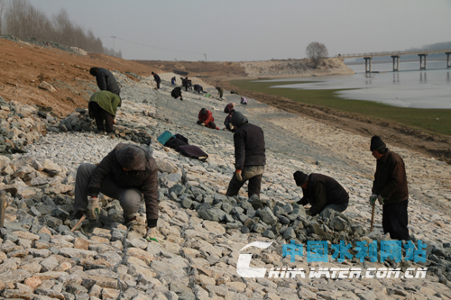 誠如這位施工人員所講,工地上,筆者看到的施工人員冒著嚴寒,堅持施工,沒有人叫苦,也沒有人叫累,干的是熱火朝天!鏟運機在堤頂上往堤腳處運輸石塊,施工人員在堤腳有的搬運,有的挑選。一名施工人員拿來一個長約1.5米、寬約1米、高約0.2米左右的鐵絲網(wǎng)片編成的網(wǎng)龍平放在堤坡的石子墊層上,然后把上面的蓋子打開,有的人員抱起石塊往里填充,有的掄起鐵錘敲打凸出的石頭棱角,讓石籠的面變得平順,直到將網(wǎng)龍?zhí)顫M、整平,然后將網(wǎng)片蓋上。一名施工人員用鋼鉗在一根長長的鐵絲上剪下一節(jié),將這個鐵絲籠縫合在一起,動作嫻熟利落。遠處,一片修好的護坡工程,坡面平順,平臺平整,表面的鐵絲網(wǎng)泛著亮亮的光,防洪工程顯得更加的宏偉壯觀。