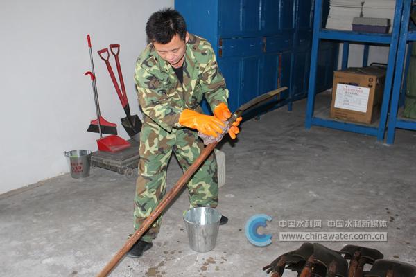 “慶君,你現(xiàn)在來“家”一趟,去找點(diǎn)兒水泥和沙子,我現(xiàn)在找工具把松動(dòng)的基層鑿清干凈。”這是“老倉庫”在汛期躬身整修消防池的一幕,他嘴里的“家”正是防汛倉庫。
