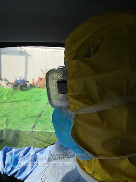 烈日下排隊等候接收病人 護(hù)目鏡里滿是水珠 何文龍攝