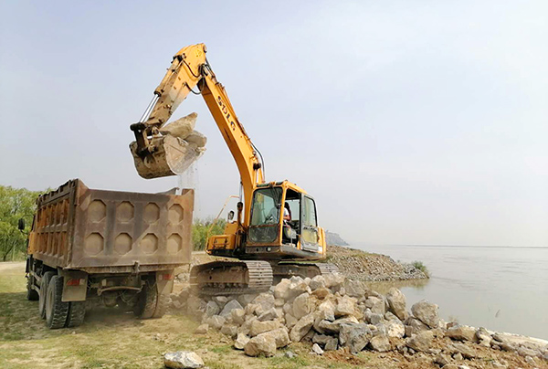 5月21日,記者在韓城南謝工程水毀修復(fù)施工現(xiàn)場(chǎng)看到,數(shù)十名施工人員正在挖掘機(jī)、鏟車的配合下進(jìn)行根石加固。