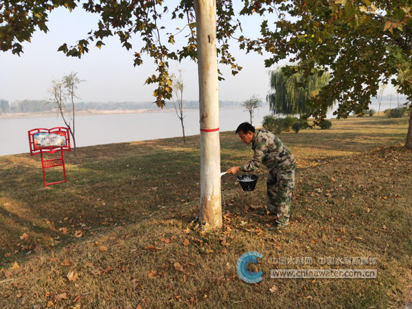 “嗨,圣儉叔,今年又是你給咱的行道林穿‘棉衣’了!”梁山黃河河務局小路口管理職工董圣儉像往年一樣給樹木涂白!昂俸伲堑哪!今年又是我,段長看我年齡大了照顧呢!”他一邊用工具戧掉行道林上張裂的樹皮,一邊答道。清理、戧皮、分隔、涂刷,他一氣呵成,不一會兒就完成了一棵樹的“換裝”工作。知易行難,知之非艱,行之惟艱。在他手中飛舞的工具到了筆者手中卻不那么流暢,似乎有些不太友好。他走上前來:“來,我教你!”緊接著,他接過工具,放慢速度,一邊演示分解動作,一邊說明注意事項。在他講授完,筆者開始了實操,雖然順利的完成了一棵樹的“換裝”工作,但是耗費的時間確是他的三倍有余,在揭下分隔膠布的那一刻,筆者手腕感覺絲絲酸痛,這個工作并不輕松,這樣的任務顯然不是領導“照顧”,而是一種信任與囑托。