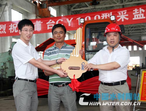 大連鹽業(yè)集團公司的企業(yè)代表從湖南江河機電鋼構(gòu)工程有限公司負責(zé)人手中接過首臺CY100型聯(lián)合采鹽機的鑰匙