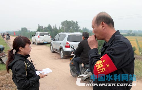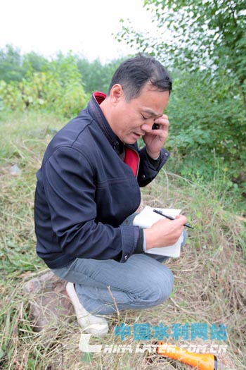 在他身后的小山坡上,一位巡查水位的中年男子用手電筒照著水里的水文標尺,然后蹲下來,用手電筒照著手里的一個小本本,記錄著什么,過了一會兒他又站起來,拿出手機通報水位。他說他每過一個小時都要打一次電話,向上面報告水情。他的一舉一動都是那么嫻熟有序,平和自然,像在家里做著家務事。