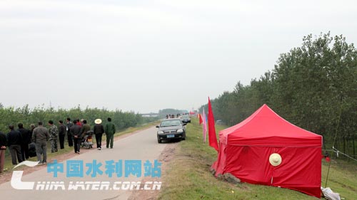 走上行洪堤,從橋口到分洪閘,大約有千米余長,排列著5個臨時搭建起來的紅色帳篷,平均200米一個。